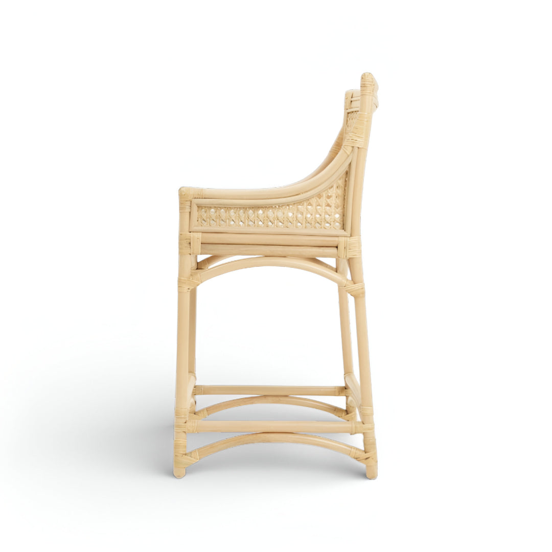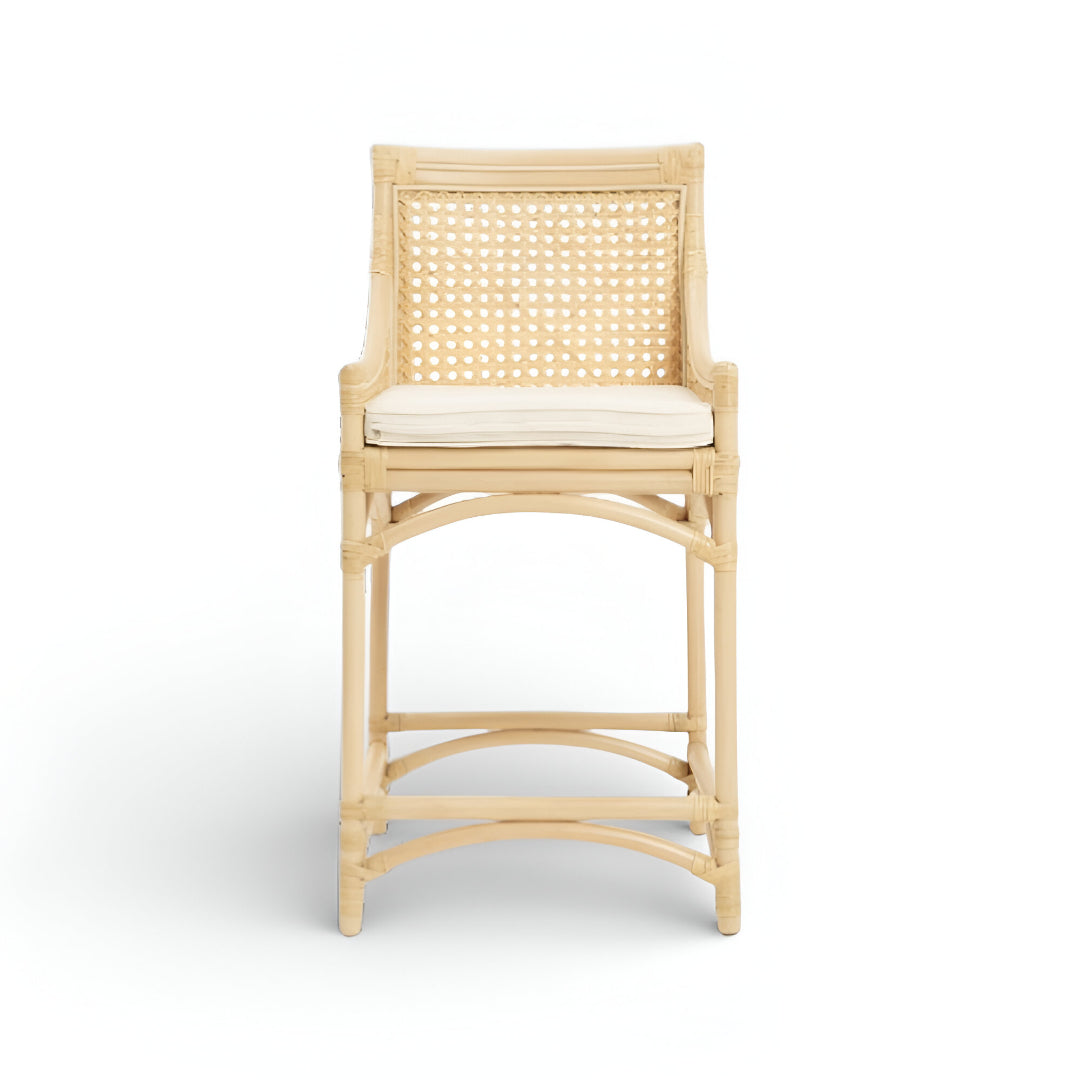 The Ambassador barstool is a perfect blend of old-school charm and modern craftsmanship. Its rattan mesh back and tall tapered legs make it a versatile addition, fitting into both commercial spaces and homes outdoors.